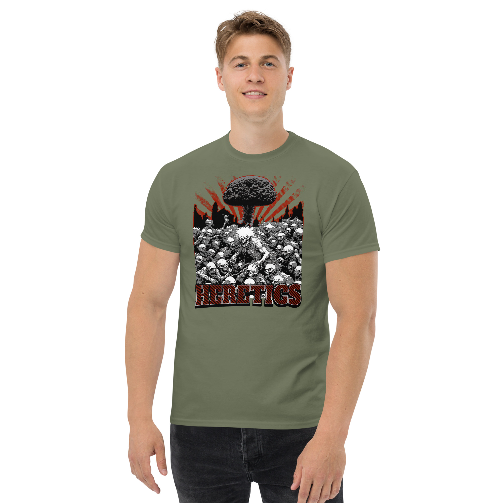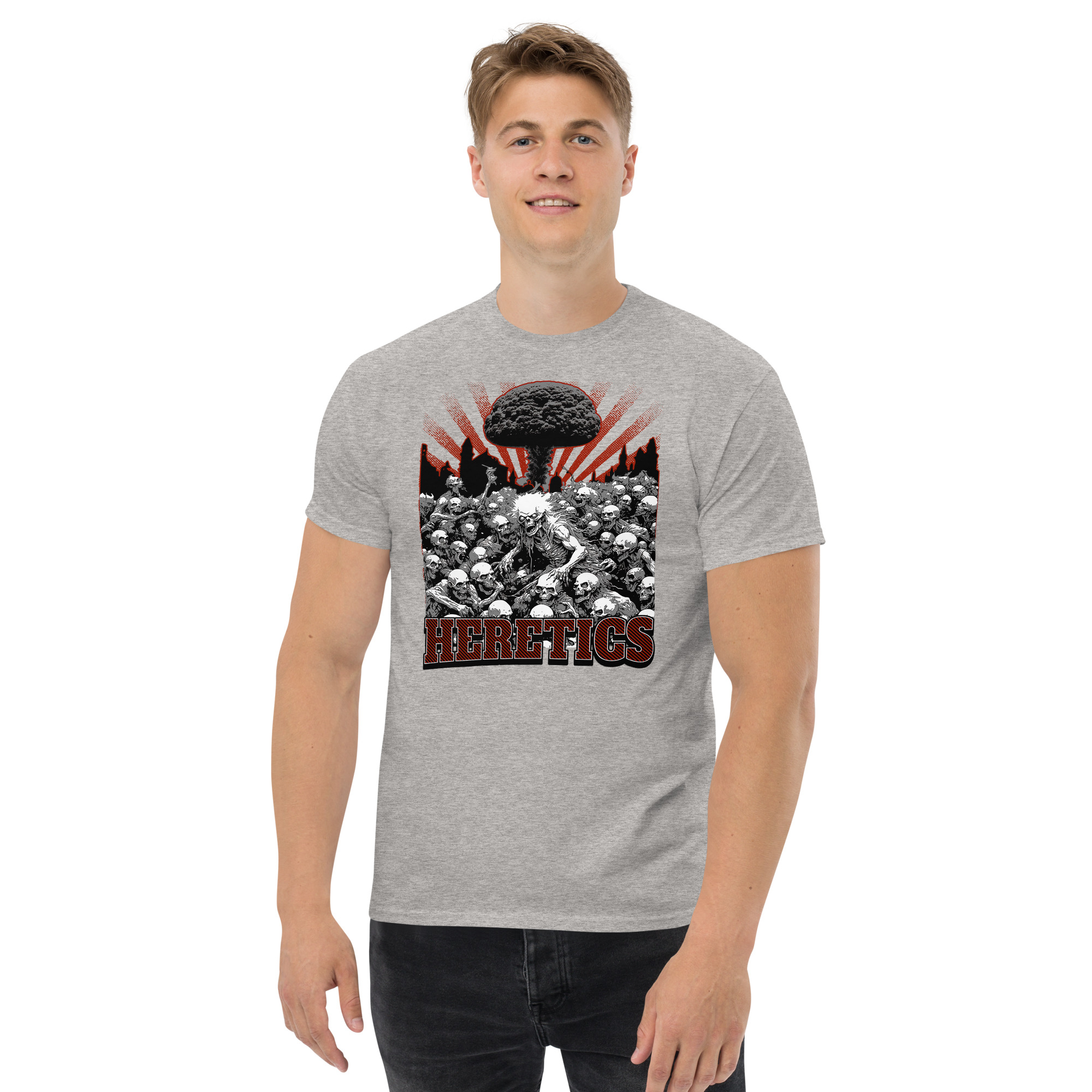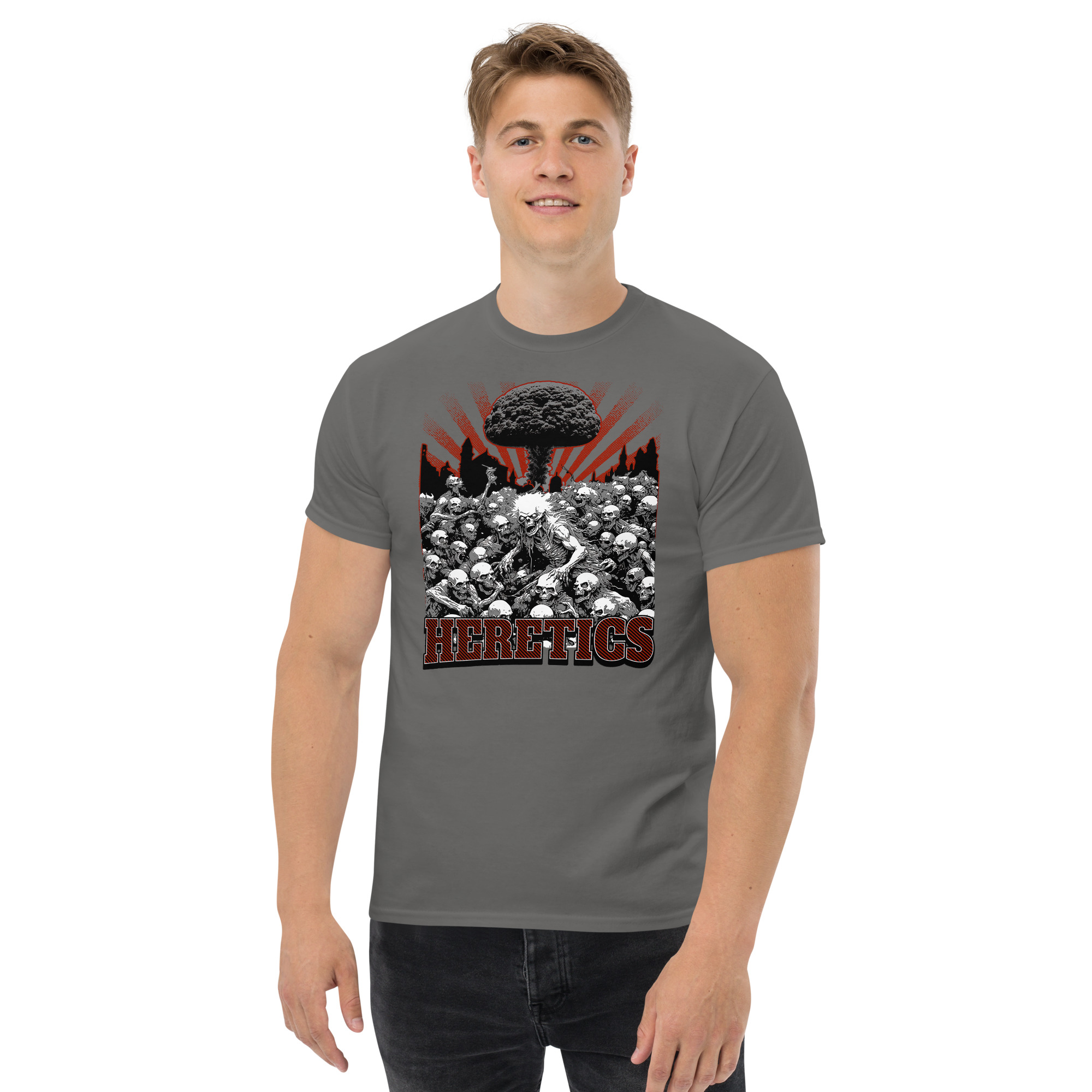 The 100% cotton unisex Zombie Heretics T-shirt will help you land a more structured look when you are hanging out with your Zombie friends. It sits nicely, maintains sharp lines around the edges, and goes perfectly with layered streetwear outfits. Plus, everyone loves zombies!